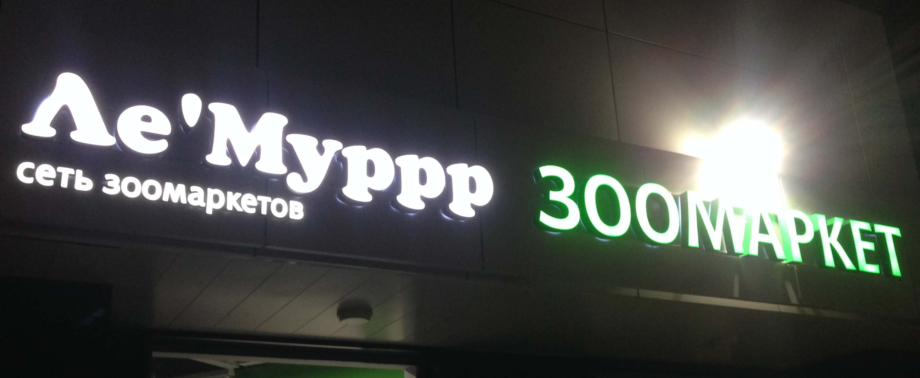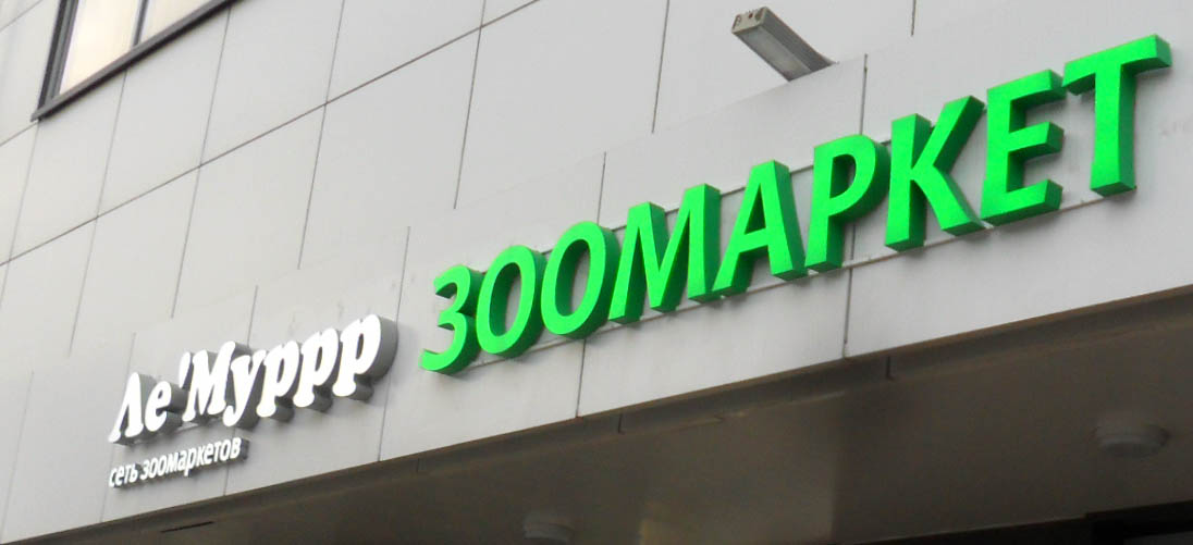 Нашей компанией выполнено рекламное оформление магазина сети зоомаркетов "Ле-муррр" фасадными и интерьерными вывесками в виде объемных светодиодных букв а также фигур из светодиодного неона,в торговых рядах "Средной" г.Нижний Новгород.